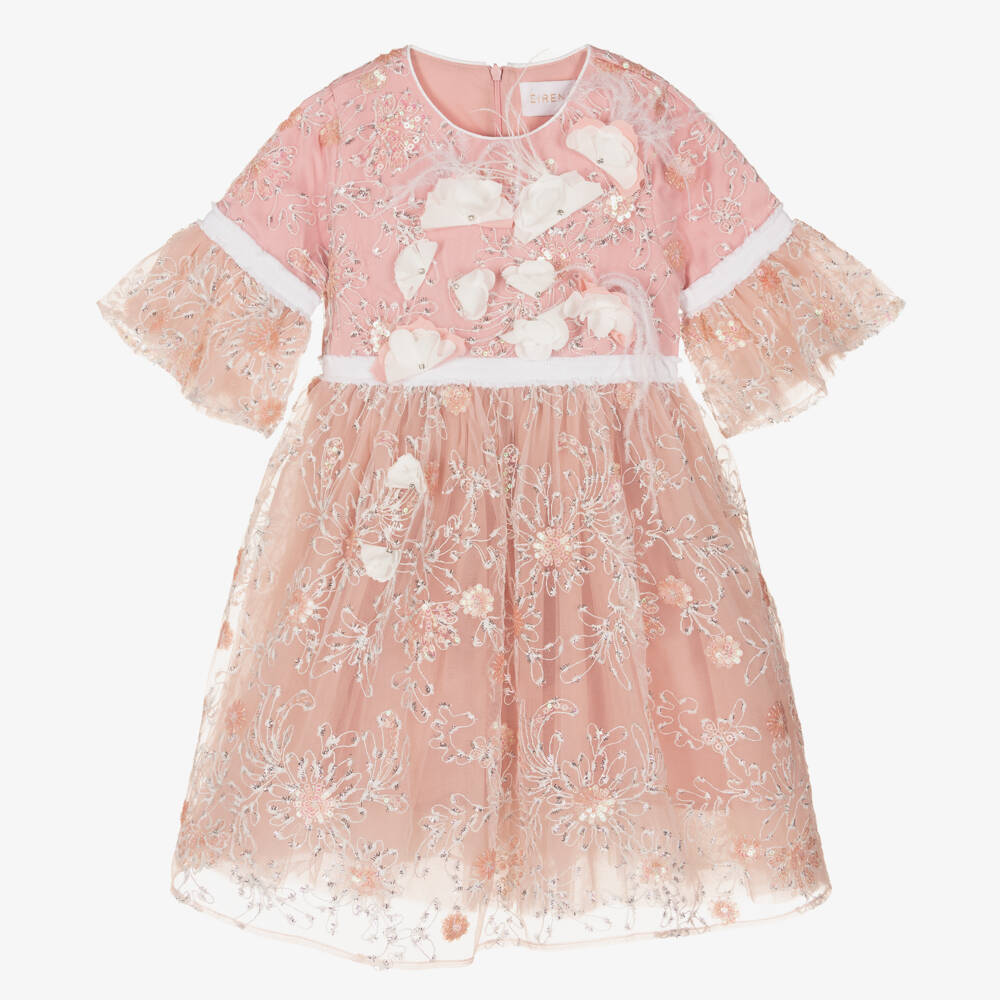 Eye-catching pink tulle special occasion dress for girls by Eirene, with white floral embroidery shimmering with sequins and tinsel. On the bodice and into the skirt are white and pink floral appliqués with diamanté centres and feather trims. The gathered skirt and flared cuffs have white trims with layers of tulle below for extra volume. The dress is fully lined in cotton for comfort and fastens with a neat, concealed zip around the back.
