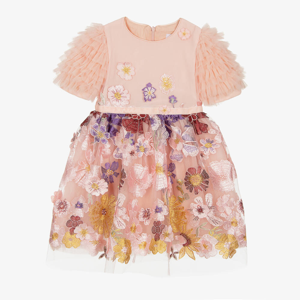 Glamorous pink tulle dress for girls by EIRENE, ideal for special occasions. Stunning floral embroidery and floral appliqués cover the fully gathered skirt and decorate the front of the fitted bodice. A pink velvet ribbon trims the waistline and the sleeves, which are made of layers of voluminous tiered soft tulle for a gorgeous feminine finish. Fastening at the back with a concealed zip, it is fully lined with soft cotton, with extra layers of tulle adding extra volume.