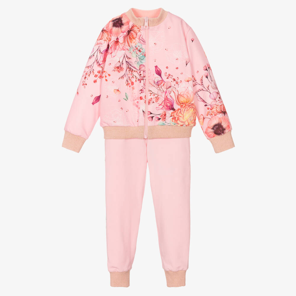 Pretty pink jersey tracksuit for girls by Eirene, with ribbed trims sparkling with golden thread. The zip-up top is made in super soft, comfortable polycotton and has a beautiful floral print in contrasting pink, yellow and turquoise blue. The cotton joggers have matching floral bands down the legs and useful concealed side pockets.