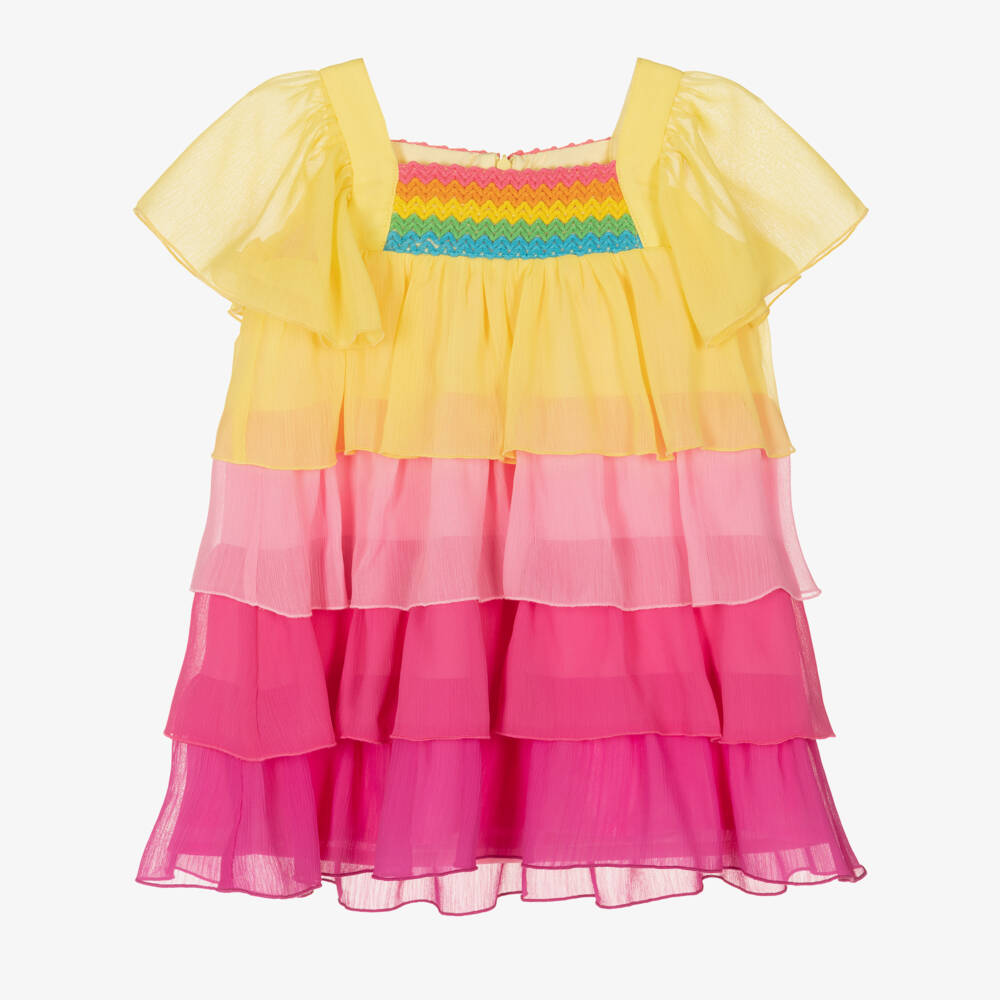 Add a vibrant pop of colour to her wardrobe with this bright yellow and pink dress, by luxury brand Eirene. Woven in beautifully soft chiffon, this summer-inspired dress has a lovely rainbow striped embroidery on the bodice. Flutter sleeves and ruffled tiers give this dress a floaty feel. It fastens effortlessly with a concealed zip on the back and has a lightweight cotton lining for comfort.