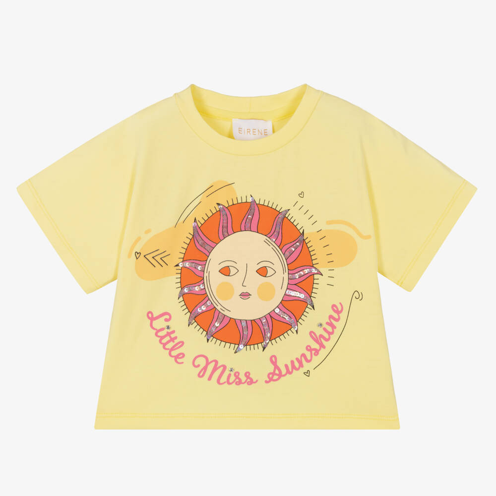 A pale yellow T-shirt for girls by Eirene, made in a beautifully soft cotton jersey. This cropped-style top has an orange, pink and red sun design on the front, with shimmering sequins for a bohemian chic look. A 'Little Miss Sunshine' slogan is printed beneath with diamanté's detailing.