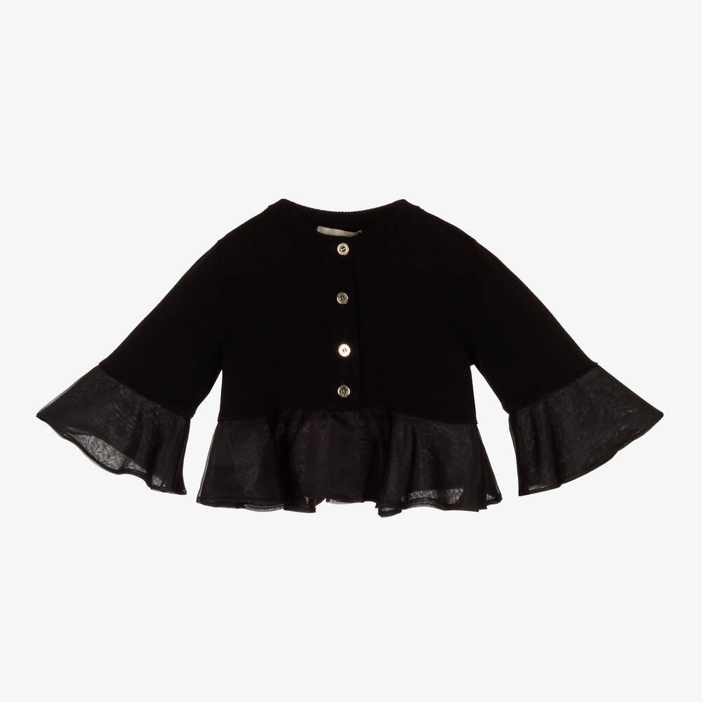 A luxury black cardigan for girls by renowned designer, Elie Saab. Finely knitted in soft cotton with gold buttons down the front to fasten, there are double layers of fluted silk organza at the cuffs and hem to create a feminine and sophisticated silhouette.