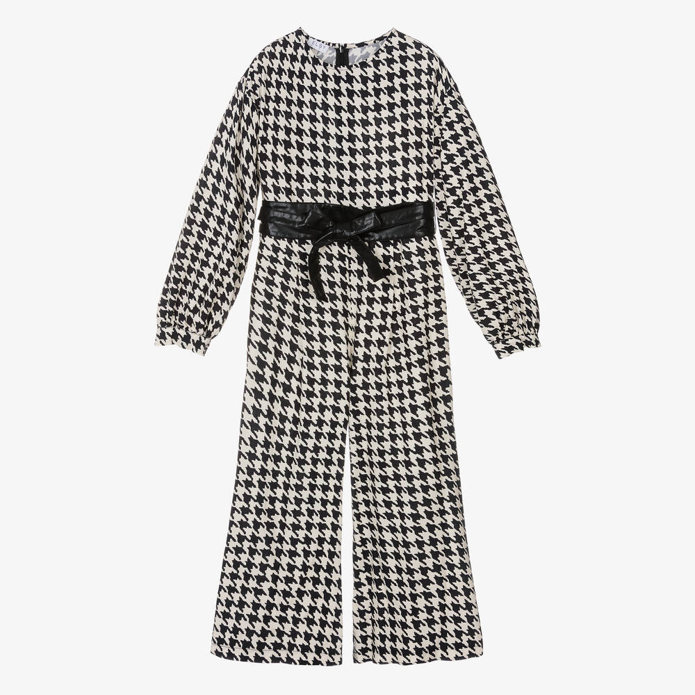 In a lovely ivory and black houndstooth pattern, this jumpsuit for girls by Elsy is made in beautifully soft and lightweight viscose. Designed with an elegant, wide-leg, it has long sleeves with buttoned cuffs. It fastens on the back with a concealed zip and has a removable faux leather tie belt for a stylish finish.