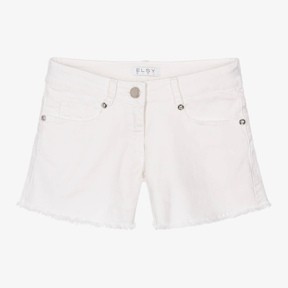 Versatile white shorts for girls, by Elsy. Made in soft stretch denim, they have a raw hem with frayed trims and shiny silver hardware. In classic five pocket styling, they have a logo embossed button fastening with a concealed zip. The waist is adjustable, promising a stylish and comfortable addition to any outfit.