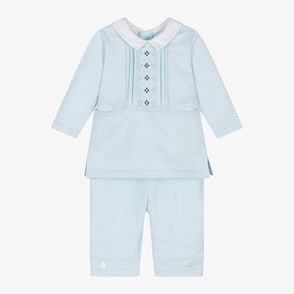 A pale blue trouser set for baby boys by Emile et Rose, made in soft cotton jersey. Traditionally styled, the top has blue and beige embroidery on the front, along with pin tuck detailing and a smart white collar. There are little front pockets and poppers on the back. The matching trousers have decorative buttons on the cuffs and a gently elasticated waistband for a comfortable fit.