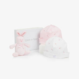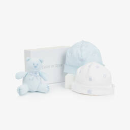 This delightful set for baby boys by Emile et Rose includes two hats and an adorable teddy bear. Made in soft, comfortable cotton jersey, the pale blue and white hats have a turned-up brim and a sweet, embroidered teddy pattern. The teddy bear is gently padded and ideal for little hands to hold. The set comes beautifully presented in a branded box, making it an ideal gift for a new arrival.