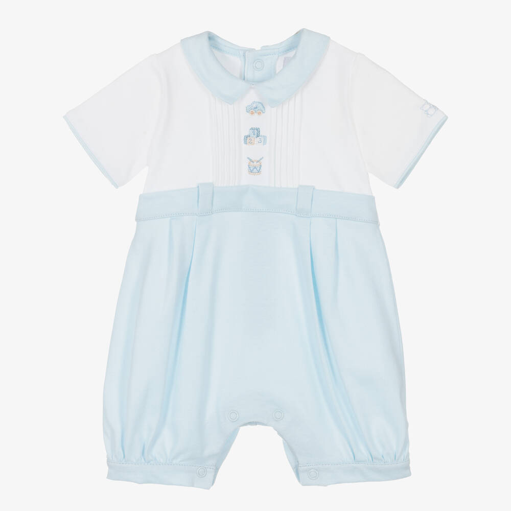 From Emile et Rose, a lovely white and blue shortie for baby boys, with adorable embroidered toys on the chest. Made in soft cotton jersey, it fastens with poppers for fuss-free dressing.