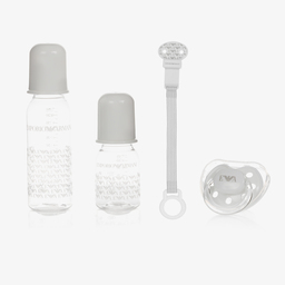 Boys four-piece baby bottle set by Emporio Armani. Included in the set are two different sized bottles with blue logo branding and matching caps. The bottles are shatterproof and easy grip, with silicone teats. Also included is a blue pacifier and dummy clip.