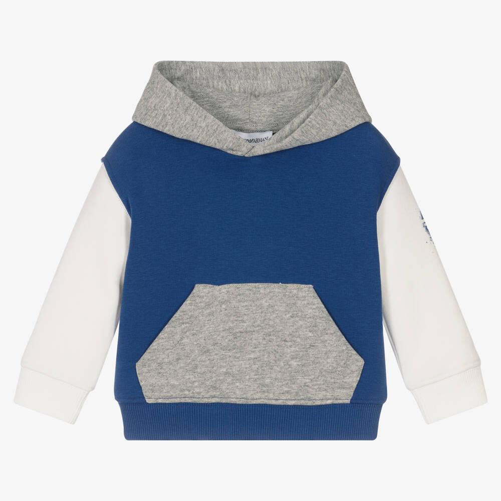 Colourblock hooded sweatshirt for baby boys by Emporio Armani, in royal blue, ivory and grey. Made in soft and comfortable cotton-blend sweatshirt jersey, it has a pouch pocket on the front and a blue Eagle logo splash print on one sleeve.