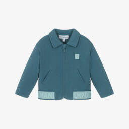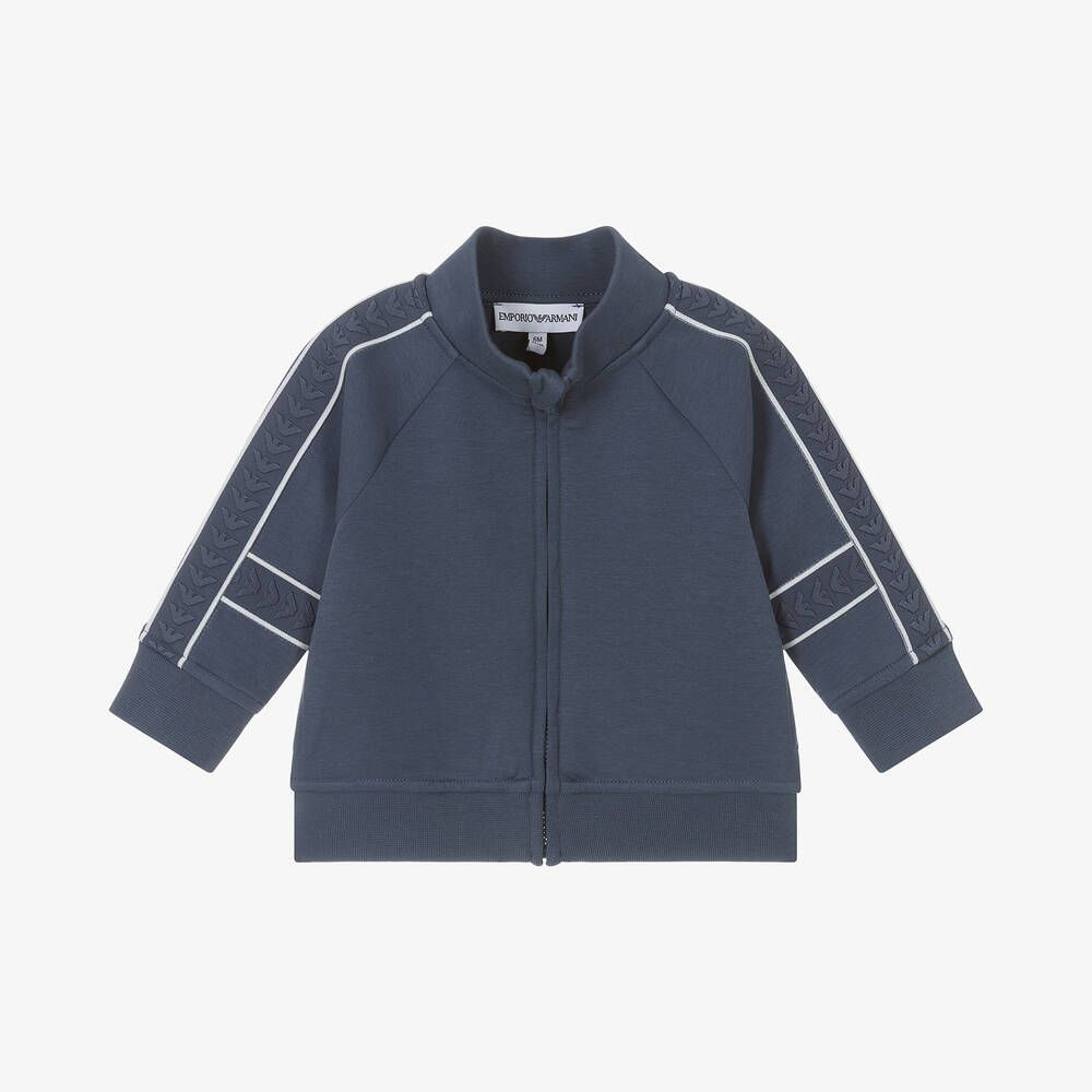 A slate blue hoodie for baby boys from Emporio Armani, made in soft, luxurious cotton-mix Milano jersey. A signature look from the Italian designer, the zip on the front is engraved with a logo and the long sleeves are trimmed with embossed Eagle branding. This sleek zip-up has side pockets and ribbed edges.