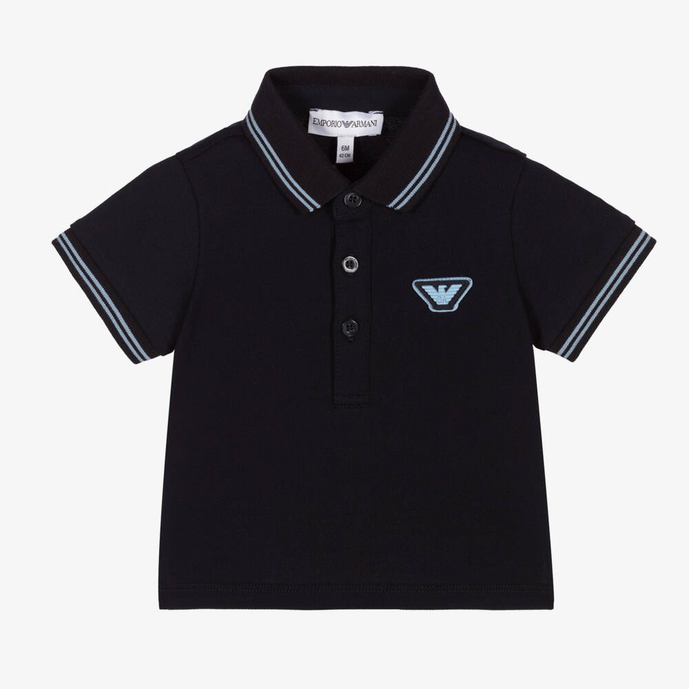 Stylish navy blue polo shirt for baby boys by Emporio Armani, made in soft cotton piqué, for a comfortable wear. It has pale blue stripes on the ribbed trims, logo button fastenings, and a rubberised Eagle logo patch on the chest, for added brand appreciation.