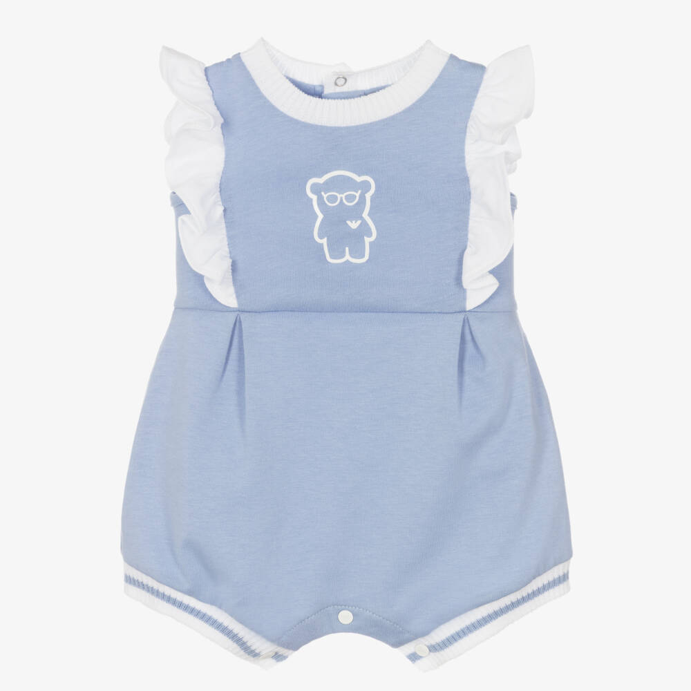 Cute blue shortie for baby girls by Emporio Armani, made in soft organic cotton jersey. It has a sweet white Manga Bear silhouette with the signature Eagle logo on the front. The shoulders have pretty white ruffles and it fastens with poppers on the back and between the legs for easy dressing.