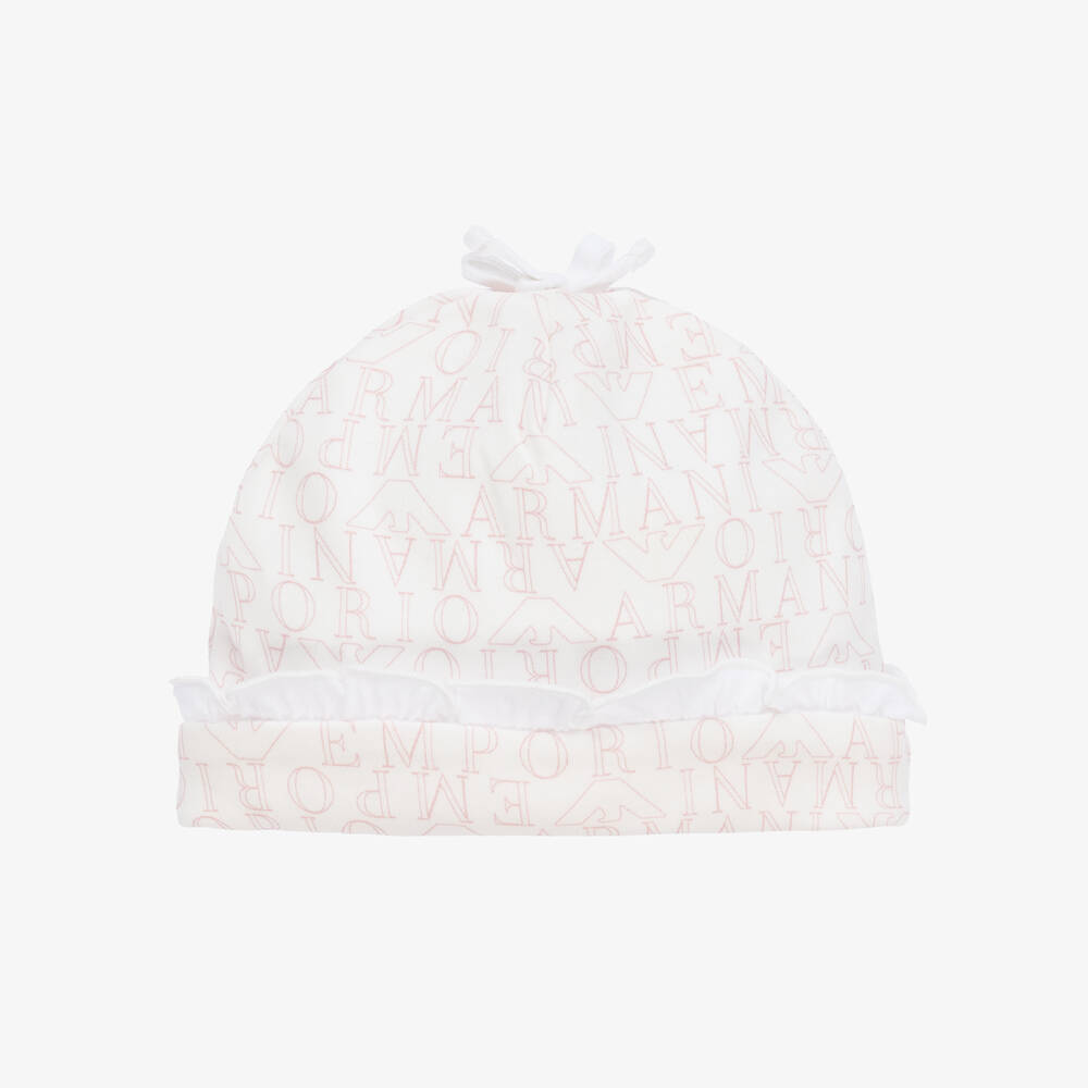 A sweet ivory hat for baby girls by Italian brand Emporio Armani, patterned with the iconic Eagle and logo prints in pink. Made and lined in luxuriously soft and comfortable cotton jersey, it has a pretty frill trim around the turn-up brim. A lovely fixed bow on the top completes the cute look.