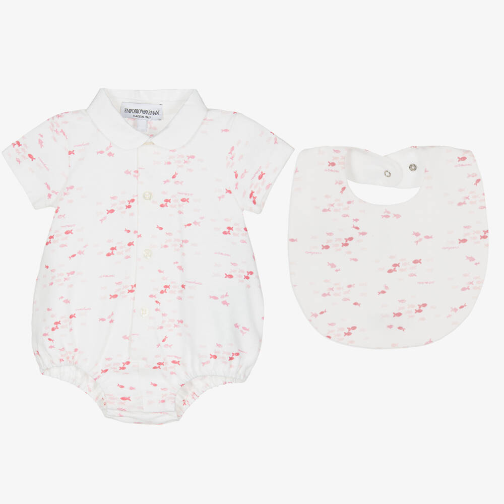 Cute white shortie set for baby girls by Emporio Armani, made in soft cotton piqué. It has a sweet pink fish print all-over incorporated with the brand's spell-out logo. Trimmed with a Peter-Pan style collar, it has button fastenings on the front and poppers between the legs for easy dressing. It comes with a popper fastening bib and an organza storage bag to complete the adorable baby set.