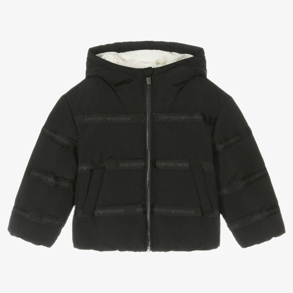 Black puffer jacket for boys by Emporio Armani, with subtle black branded tape detailing throughout. Water repellent and lightweight, this hooded jacket has a contrast ivory lining and two slanted front pockets with popper fastenings. There is a front zip fastening with additional chin guard for extra protection, and it is elasticated at the cuffs and the waist to keep the cold out.