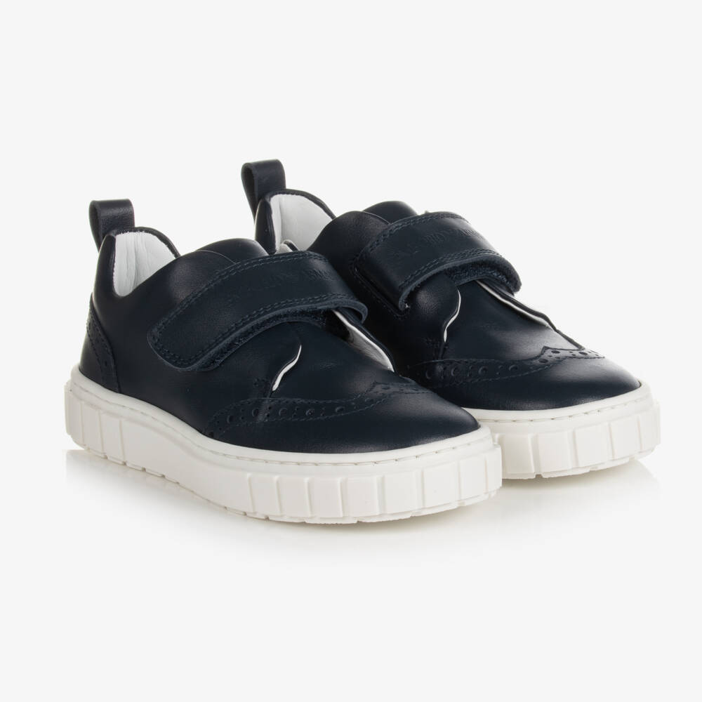 Navy blue trainers for boys by Italian brand Emporio Armani, with a luxuriously soft leather upper and insole. For a neat designer style, they have intricate brogue detailing and logo-embossed velcro strap fastenings. There are pull tabs on the back, and non-slip rubber soles.