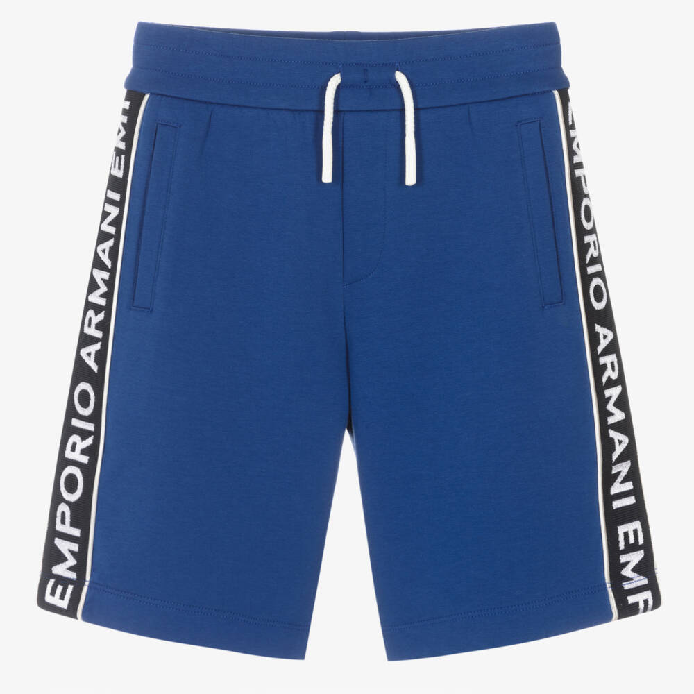 Unmistakably Emporio Armani, these royal blue shorts for boys have navy blue and white embroidered logo trim on the sides. A comfortable and casual style, they are made in soft double-faced cotton jersey. The waistband is elasticated with faux drawstring detail, and they have useful front pockets.