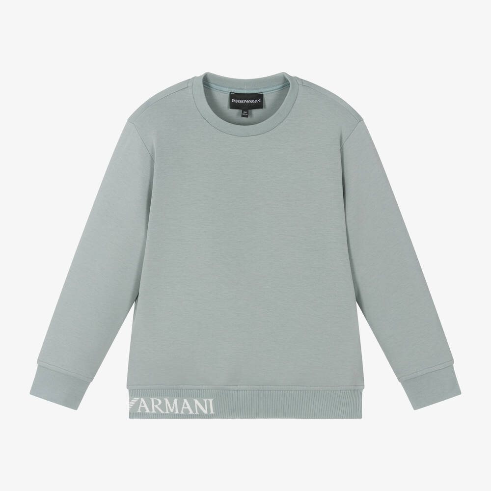 Green-blue cotton sweatshirt by iconic Italian designer Emporio Armani, adding a designer touch to boys casual wardrobe. Made in soft, lightweight jersey, it has long sleeves, ribbed trims and a jacquard Emporio Armani logo on the hemline.