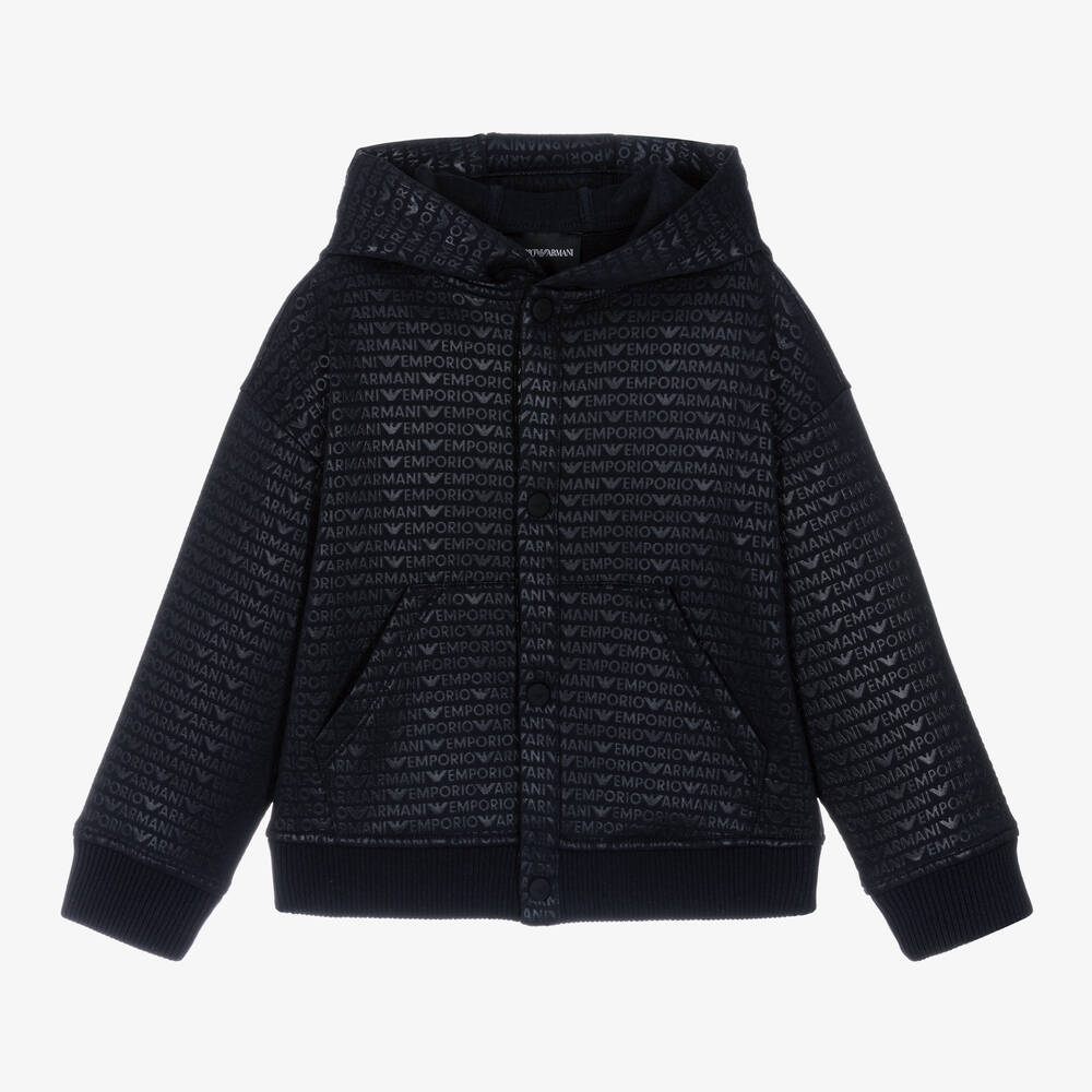 A navy blue sweatshirt-style cardigan for boys by Italian designer Emporio Armani. This cool top is made in a mid-weight cotton blend jersey, with all-over tonal branding for a distinctive look. It has a ribbed hemline and cuffs, and logo popper fastenings on the front. There is a fixed hood and hand warmer pockets for extra cosiness.
