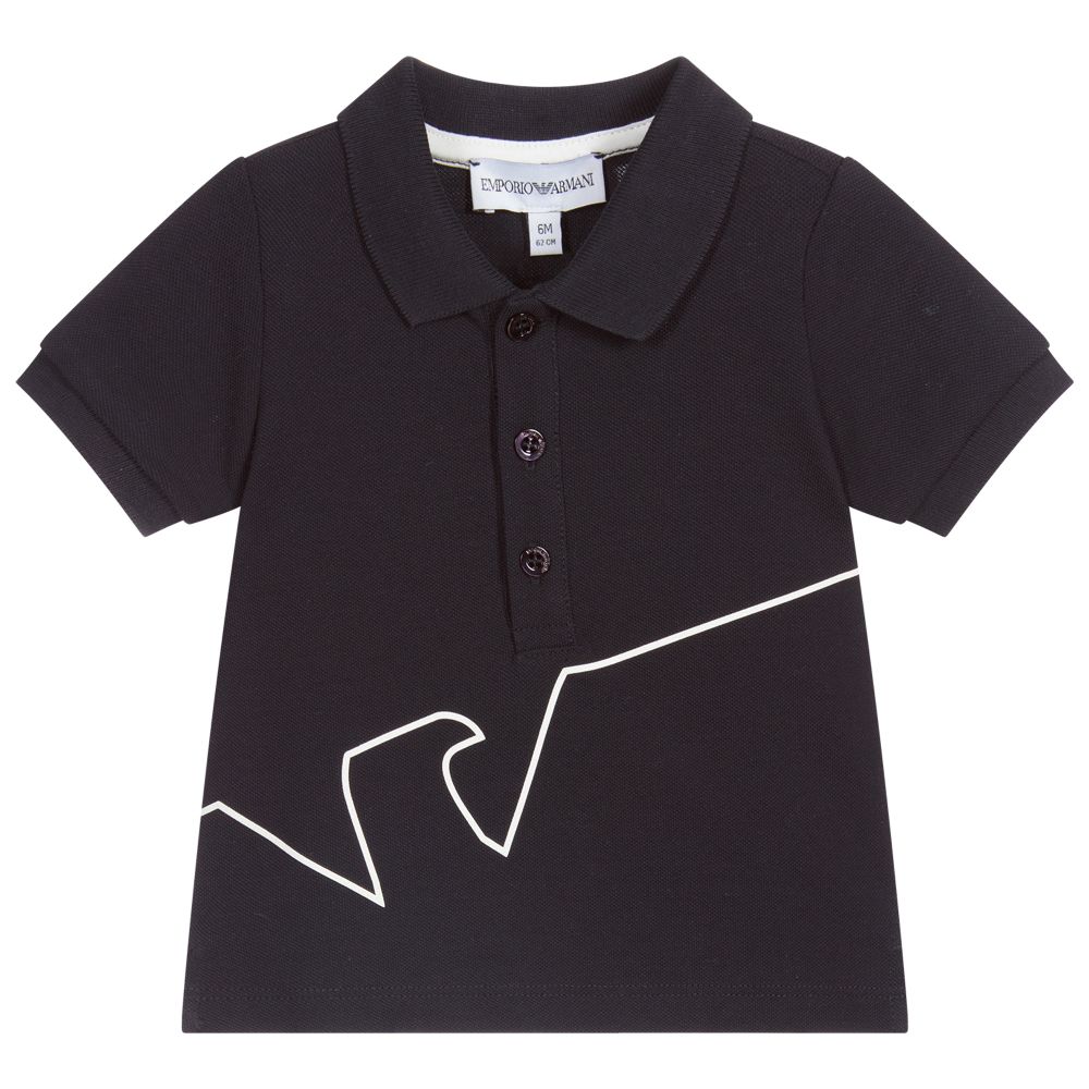 Dark navy blue polo shirt for little boys by Emporio Armani, made in soft and stretchy cotton piqué. It has a raised white rubber Eagle logo on the front and a raised white logo print on the back at the hem.