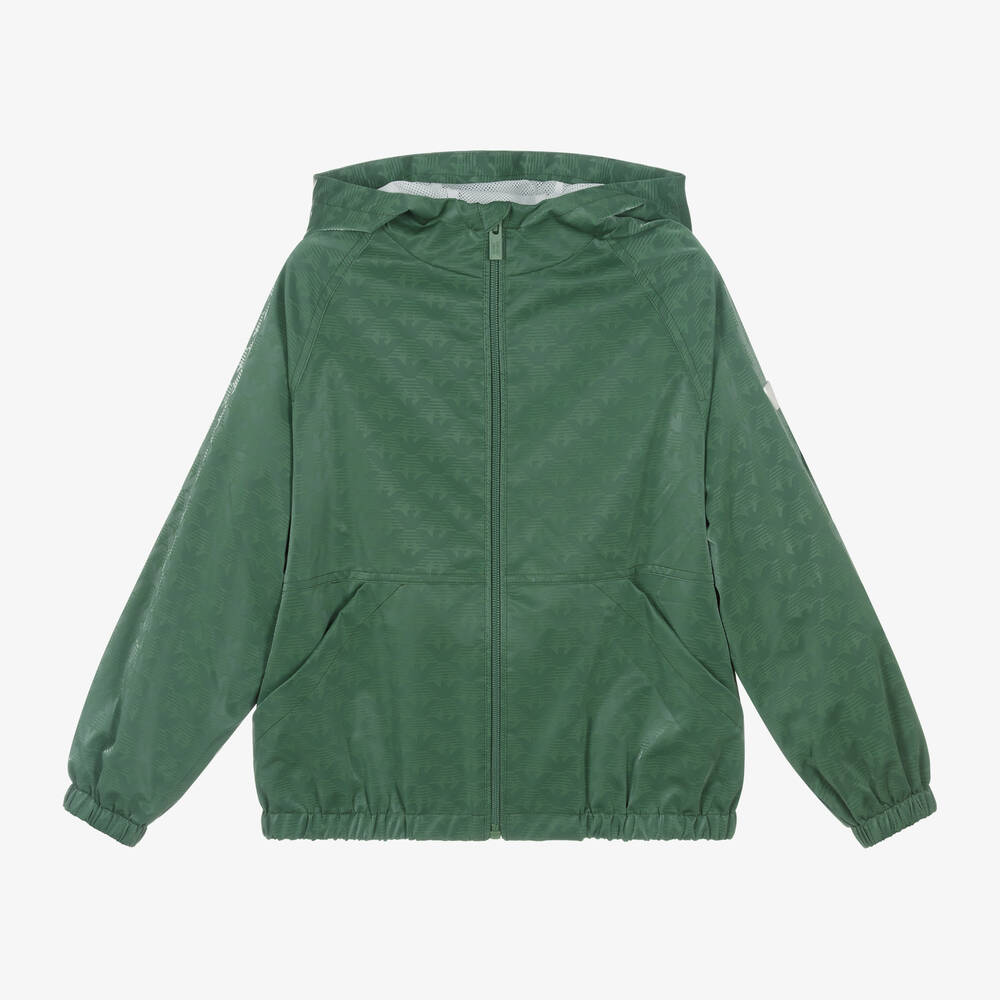 Green hooded zip-up windbreaker for boys by Emporio Armani, with a tonal Eagle logo pattern. Silky smooth, it is lined in soft mesh and has gently elasticated trims for a snug fit. There are useful pouch pockets on the front, with a rubberised Eagle logo on one sleeve adding an extra designer touch.