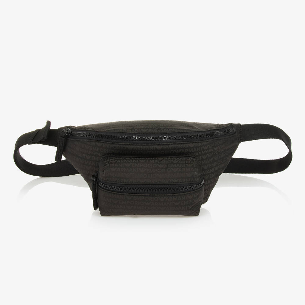 Dark khaki green belt bag for boys from Emporio Armani, made in silky smooth fabric with a distinctive logo pattern. To store essentials safely in style, both compartments are fully lined and open with black webbed zip pulls. Using the adjustable, buckle fastening strap, this lightly padded bag can be worn across the body or around the waist.