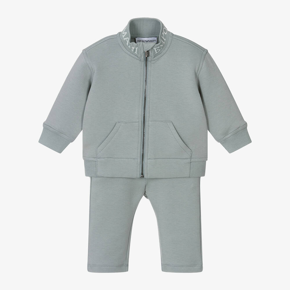 A light grey-blue tracksuit for little boys from Emporio Armani, made in soft and smooth cotton blend jersey. The cool zip-up top features the Italian brand's white intarsia logo on the ribbed, stand-up collar for instant recognition, a chin guard for added comfort, and a branded zip puller. Easy to pull on, the joggers have an elasticated waistband. This practical, casual ensemble has front pockets on both pieces.