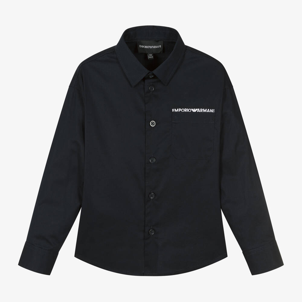 Синяя хлопковая рубашка для мальчиков от итальянского бренда Emporio Armani. Изготовлена из гладкого поплина с эластаном, имеет заостренный воротник, длинные рукава, классическую застежку на пуговицы и слегка закругленный подол. Белый логотип вышит над нагрудным карманом для стиля и контраста.