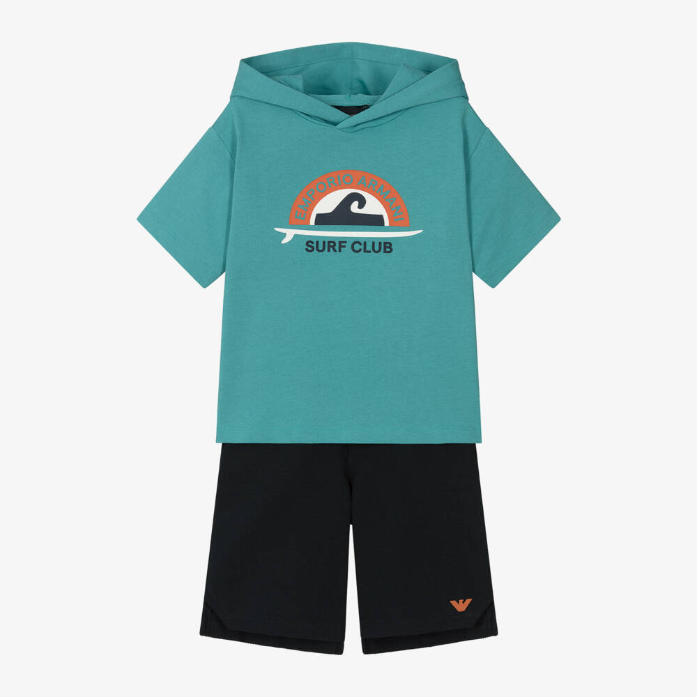 Combining designer style and comfortable casual wear, this teal green and dark navy blue cotton shorts set for boys is from Emporio Armani. The short-sleeved, hooded jersey top has a relaxed fit and a surf-themed logo print in orange, white and navy blue. It pairs with navy blue shorts, that have a sporty piqué jersey feel with an easy, elasticated waistband and practical front pockets. The cuffs are stepped and shaped, and finished with an orange Eagle logo.
