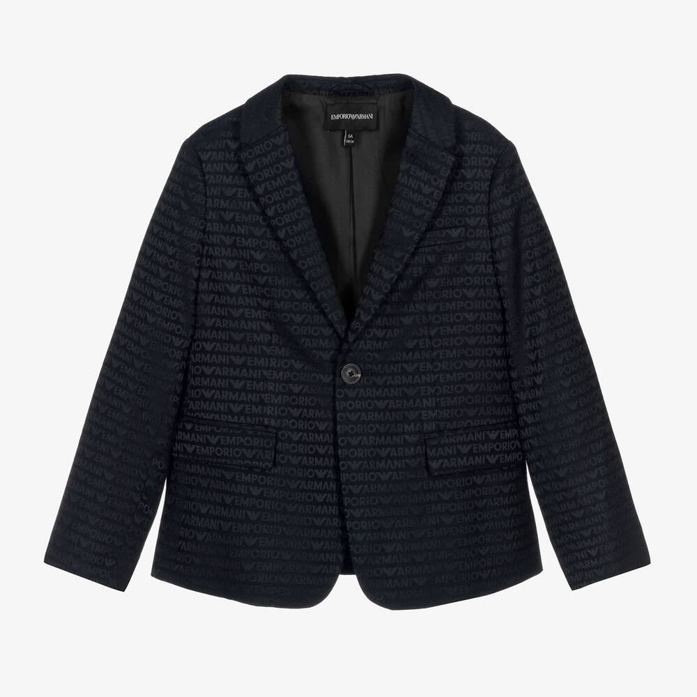 A dark navy blue blazer for boys from Italian fashion house Emporio Armani, made in a soft wool and viscose blend. This tailored design offers understated luxury thanks to jacquard Emporio Armani branding. Styled with notched lapels and three front pockets, it is lined with silky fabric for comfort and fastens with a logo-engraved button on the front. Three button trims on each sleeve complete this smart look.