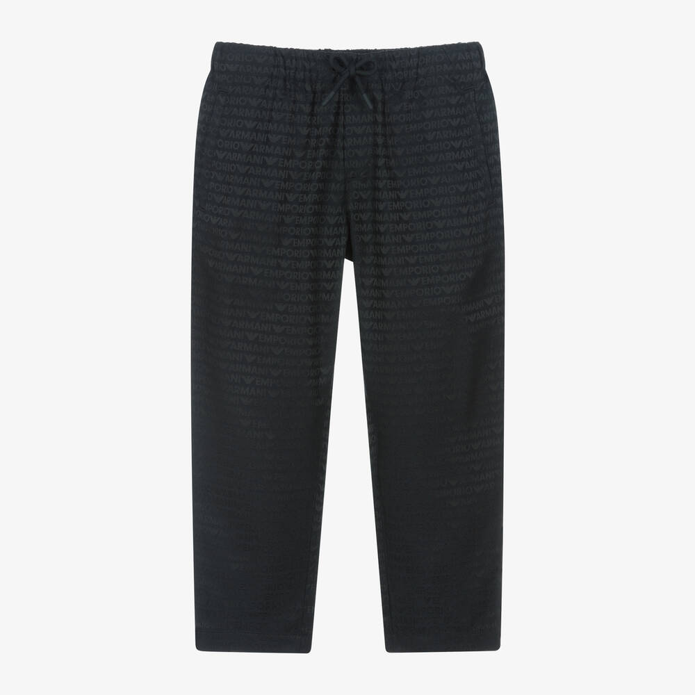 Navy blue trousers for boys by Italian label Emporio Armani, patterned with tonal, repeat branding for a stylish designer look. Made in a lightweight viscose blend with a subtle sheen, these smart trousers are designed in a tapered fit, with neat pockets on both the front and back. They have a stretchy, elasticated waistband with a decorative drawstring tie to ensure a comfortable fit.