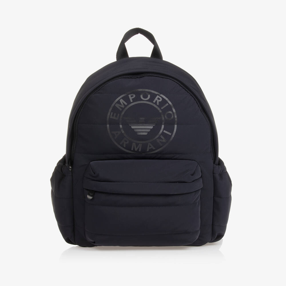 A dark navy blue backpack for boys by Emporio Armani, printed with a circular logo design and Eagle motif on the front. The main compartment is especially roomy for carrying essentials and features a velcro pocket inside for further organisation. A zip pocket on the front, along with elasticated side pockets make this a practical bag for everyday use. The quilted fabric is lightly padded and the mesh back panel provides extra comfort. It has adjustable shoulder straps and a sternum strap that clips across the chest. This allows for comfortable weight distribution.