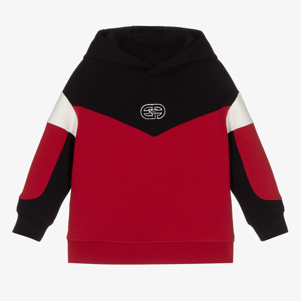 Dark navy blue and red hoodie for boys by Emporio Armani, made in super soft Milano jersey. Featuring a navy blue Eagle logo appliqué on the front, it has sporty white trims on the shoulders and casual ribbed cuffs.