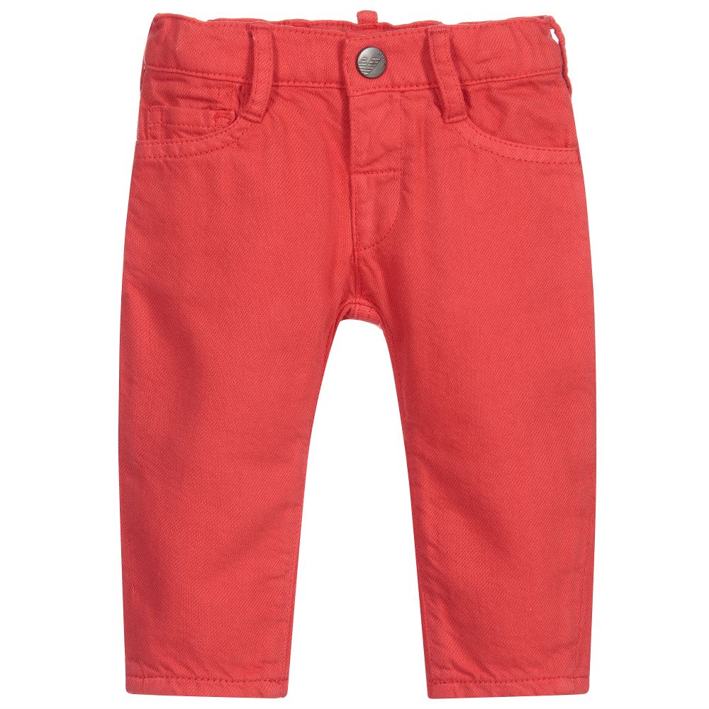 Red trousers for little boys by Emporio Armani, made in soft, brushed cotton twill. They have a classic five pocket design, with a popper fastening and a useful adjustable waistband. There is a metallic Emporio Armani logo badge on the back pocket.