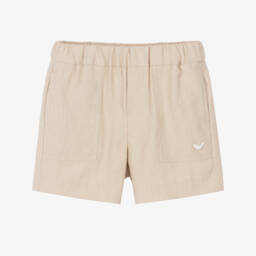 Red shorts for little boys by Italian designer Emporio Armani. Made in double cotton jersey, they have a black Eagle logo pattern against a thinly striped background, creating an op-art look. There are faux pockets on the front. Easy to wear, they simply pull up.