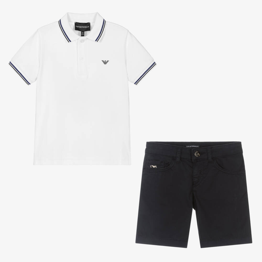 White and navy blue cotton shorts set for boys by Emporio Armani, ideal for a smart-casual look. The piqué polo shirt has blue and black striped trims, with a signature black Eagle logo printed on the chest for brand recognition. It fastens with buttons on the front. The top pairs with navy blue, five-pocket shorts for a coordinated look, featuring silver metal logo badges on the pockets. The shorts fasten with a button and zip and have an adjustable waistband for a comfortable fit.
