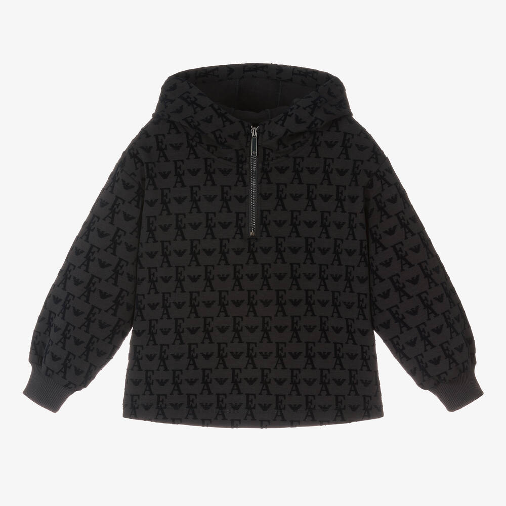 Dark blue hooded top for girls by luxury brand Emporio Armani, made in a mid-weight cotton jersey blend. Easy to pull on, it has an all-over flocked Eagle logo pattern for signature style. It has a half-zip fastening with an attached inner pannel for added comfort and movement.