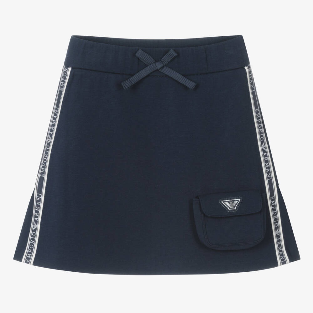 Sporty navy blue skirt for girls by iconic Italian designer Emporio Armani, with white logo taping down the sides. It is made in comfortable cotton jersey, with a stretchy, elasticated waistband that has a faux drawstring. There is a fun flap pocket on one side with a popper-fastening flap and the signature Eagle logo badge on the front. Around the back, the hemline has a cute ruffle.