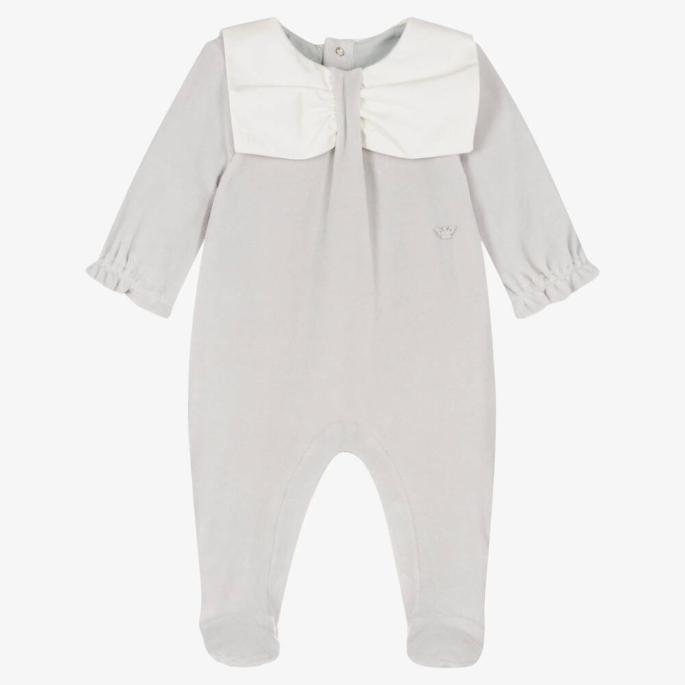 A sweet pale grey babygrow for girls by Emporio Armani, made in the softest cotton velour. The brand's signature EA logo is embroidered onto the ivory bib-style collar, with an Eagle charm beneath. It is finished with stretchy ruffled cuffs and helpful popper fastenings. Comes with a lovely branded storage bag.