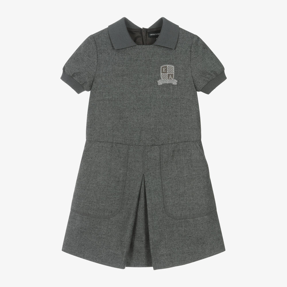 A smart, short-sleeved dress for girls by Emporio Armani. Made in soft wool and cashmere blend flannel, it has a lightweight, silky viscose lining for comfort. A ribbed collar and cuffs, along with an appliqué crest logo badge, create a stylish varsity look. The skirt has inverted pleats on the front and back and the front patch pockets have tonal topstitch detailing. A neat, concealed zip fastens on the back.