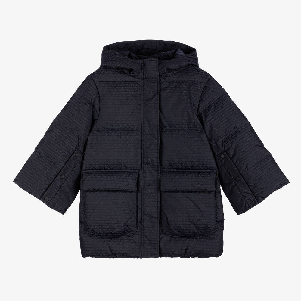 Темно-синий пуховик с капюшоном для девочек от Emporio Armani из шелковистой ткани с логотипом по всей поверхности. Утеплен пухом, имеет карманы с кнопками и уютной флисовой подкладкой. Широкие рукава с кнопками по бокам и эластичный подол защищают от холодного ветра. Молния с фирменным пуллером и защитой для подбородка скрыта за панелью с кнопками.