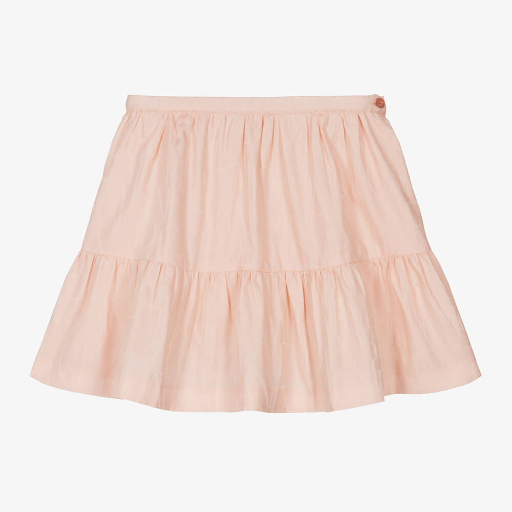 Pretty pink cotton skirt for girls by Italian designer Emporio Armani, patterned with subtle jacquard logos. Lightweight, it has a deep frill around the hemline and a comfortable, elasticated waist. There is a logo button fastening on the side and a full cotton voile lining.