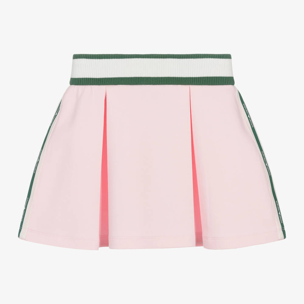 A sporty pink skirt for girls by Emporio Armani, with green and white logo tape trims for a distinctive designer look. Both casual and stylish, it is made in soft and stretchy cotton-blend jersey, with a wide ribbed waistband for a comfortable fit.