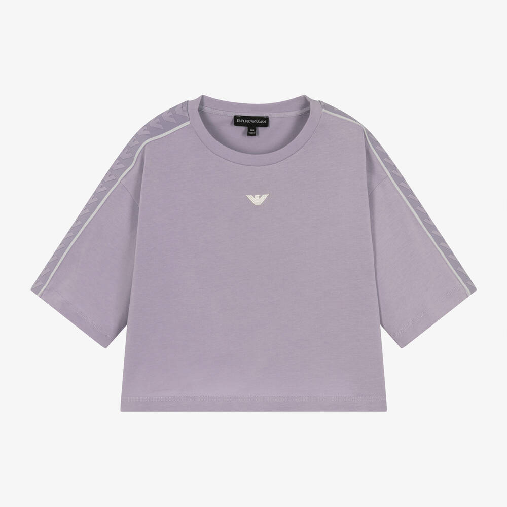 Футболка свободного кроя для девочек от Emporio Armani в приглушенном фиолетовом цвете. Изготовлена из мягкого хлопкового трикотажа, украшена вышитым рельефным логотипом Eagle спереди и эластичной брендовой жаккардовой лентой на коротких рукавах для выразительного акцента.
