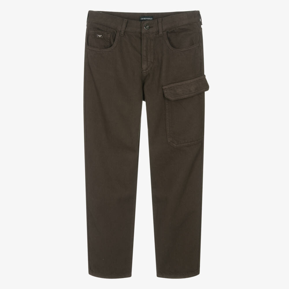 From Italian brand Emporio Armani, a pair of dark brown cargo trousers for teen boys. A military-inspired style, these five-pocket trousers have an additional flap pocket on the thigh for extra essentials. A metal EA logo can be seen on the coin pocket, along with a distinctive Eagle motif on the back for refined detailing. They fasten with an engraved button and a concealed zip fastening on the front.