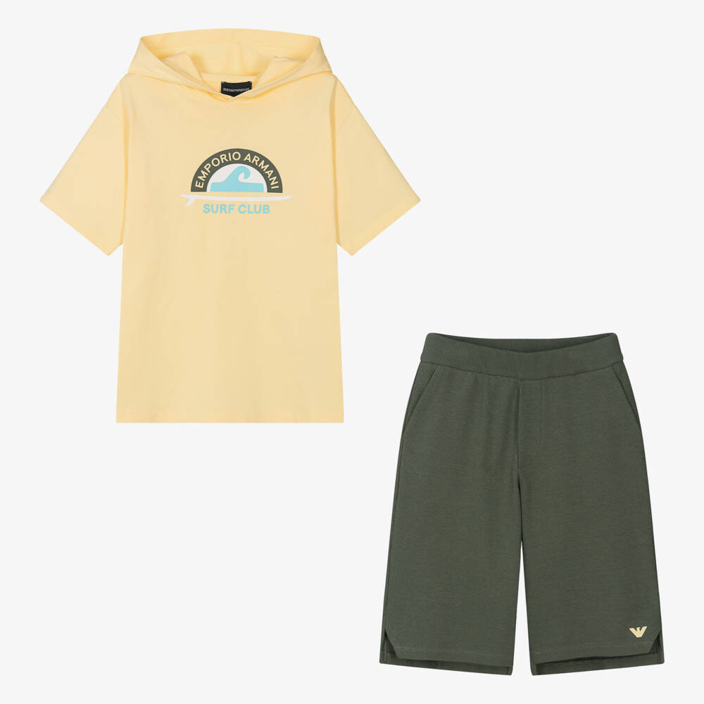Yellow and khaki green shorts set for teen boys by Emporio Armani. For instant designer appeal, the short-sleeved jersey hoodie top has a cool surf-themed logo print in khaki, blue and white. The coordinating shorts are made in a mid-weight piqué jersey with practical front pockets and a comfortable elasticated waistband. They have stepped, shaped hems with a yellow Eagle logo on the front for a stylish finish.