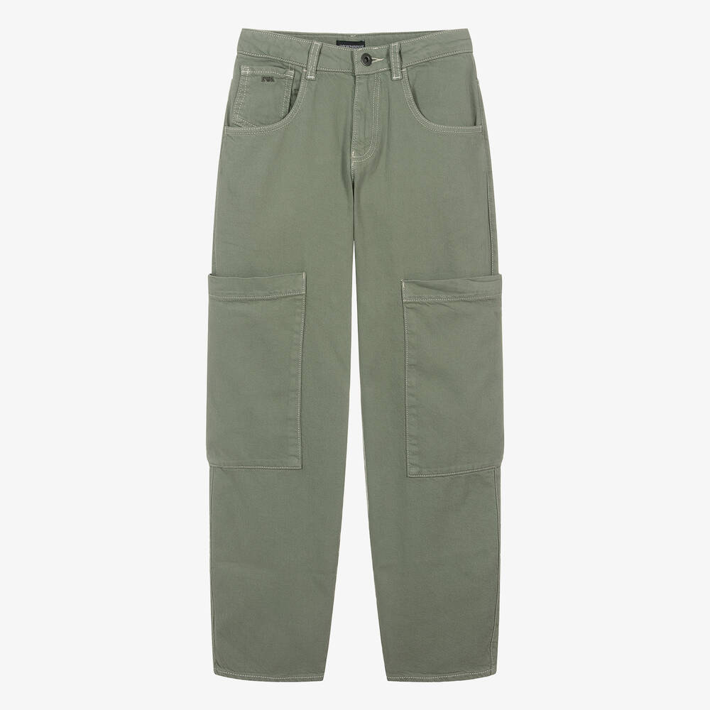 Sage green, relaxed-fit trousers for teen boys by Italian brand Emporio Armani. Designed in five-pocket jeans styling, they have an additional oversized pocket on each leg for a cool cargo look. The brand's iconic Eagle logo in antiqued silver tone can be seen on the back and coin pocket. Made in soft, mid-weight cotton twill, they fasten with a button and zip on the front.