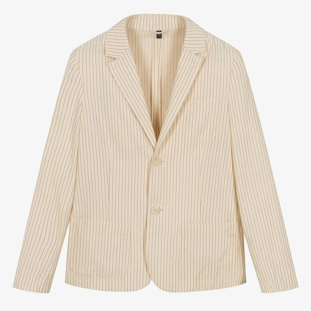 Smart ivory and navy blue pinstriped blazer for teen boys by Italian brand Emporio Armani. Impeccably tailored in a soft cotton and linen blend with tonal textured stripes, this classic single-breasted style features a notch lapel, double vent and three front pockets. Branded button fastenings and tonal EA Eagle logo embroidery add an understated luxury finishing touch. Unlined, it is comfortable and lightweight for a stylish warm weather look.