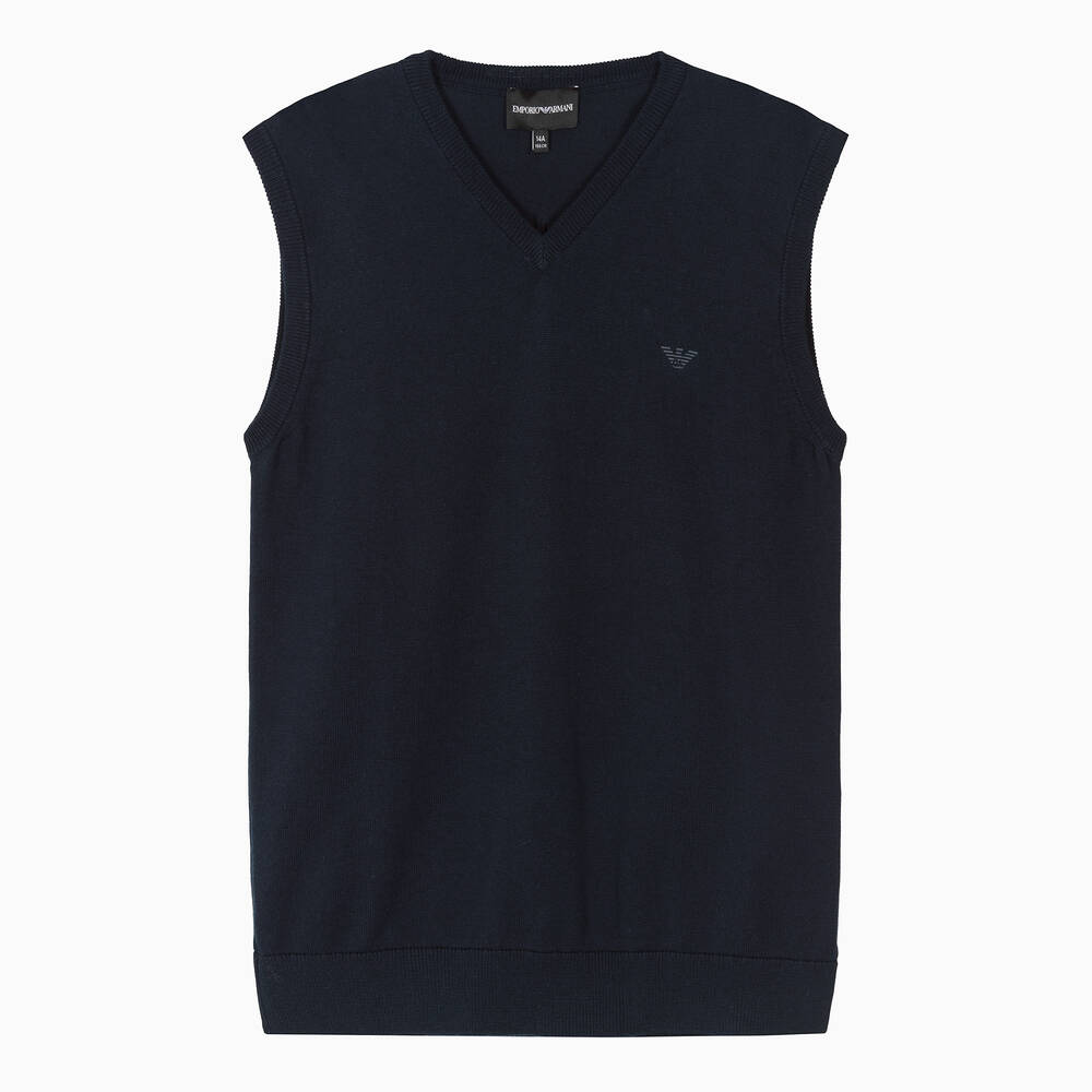 Smart navy blue sweater vest for teen boys by Italian designer, Emporio Armani. Understated and timeless, the brand's iconic Eagle logo is stamped on the chest in a tonal shade. This sleeveless, slip-over style has a subtle V-neck with a ribbed trim, and is knitted in soft cotton for luxe comfort.