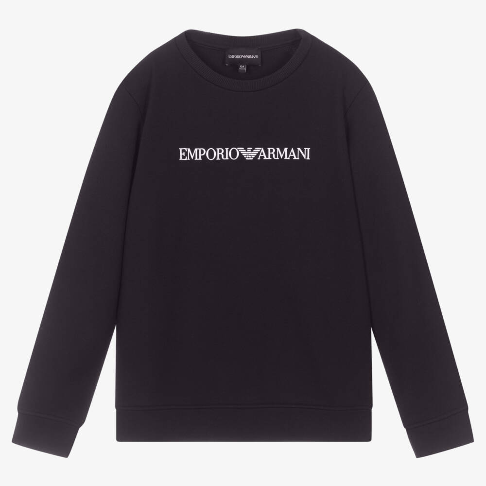 Classic navy blue sweatshirt for teen boys by luxury brand Emporio Armani. Made in a soft blend of modal cotton jersey, it has a white rubberised logo across the front and a ribbed crew neckline.